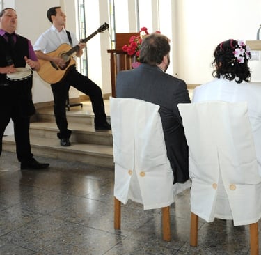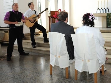 Unser Programm ist in der Regel in Musikblöcke von jeweils 15 bis 20 Minuten eingeteilt und erstreckt sich über 3 – 4 Blöcke mit entsprechenden Pausen. Insgesamt ergibt das etwa eine Stunde Musik, bei etwa 3 Stunden Anwesenheit. Je nach Bedarf ist das Programm aber auch frei nach Euren Wünschen einzuteilen